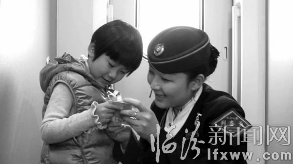 临汾新闻网讯 春运期间,为确保儿童乘车安全,太原客运段“晋之星”高铁动车组特别制作了带有儿童姓名、家长坐席等内容的“儿童乘车爱心提示卡”,为带孩子出行的乘客提供贴心服务。图为大西高铁临汾西站开往北京西的G618次动车乘务员在为小朋友佩带“爱心提示卡”。 (郝欣)