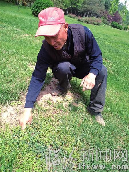 上午10点,67岁的康神官已经忙活了近3个小时,只见他蹲伏着将一块块草坪卷铺设平整,为了确保每块草坪之间不留缝隙,铺完之后他又用手轻轻摁压片刻,然后往前挪动开始铺下一块草坪……