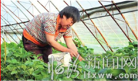 在大棚里侧的空地上,还栽有生菜、菠菜、油麦菜等新鲜蔬菜。张合珍介绍说:“这都是我自己买籽种的,见棚里有空地,大家就买点籽种上点儿菜,咱这一天在大棚里待着,知道不打农药,吃着也放心不是。”每天中午,张合珍在棚里拔上两苗菜叶,骑车子在回家路上买点儿面,回家后简单的吃口就又骑上车子来了。每次来摘草莓的市民看着青菜稀罕,热心的张合珍就会找来袋子免费让他们带上点儿。“你还别说,时间长了,有的人来采摘时,还专门跑到我这6号棚,冲着我这点儿青菜而来。”张合珍说完,又弯下身投入到紧张的工作中。