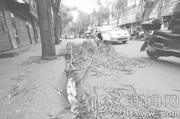 记者相继走访了体育街、鼓楼东大街及解放路等路段,大风造成很多树枝掉落,而且部分路段街边商户搭起的棚子也被吹翻。“一到大风天气树枝就乱掉,万一不小心被大树枝砸到怎么办,难道没有人管管吗?”一位途经解放路的市民说。