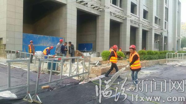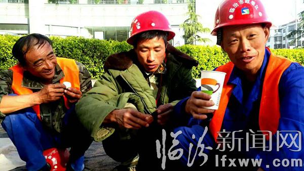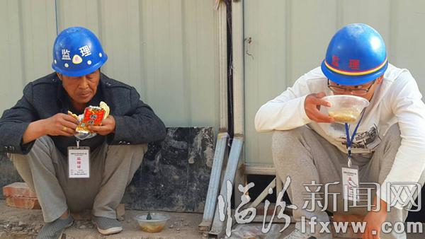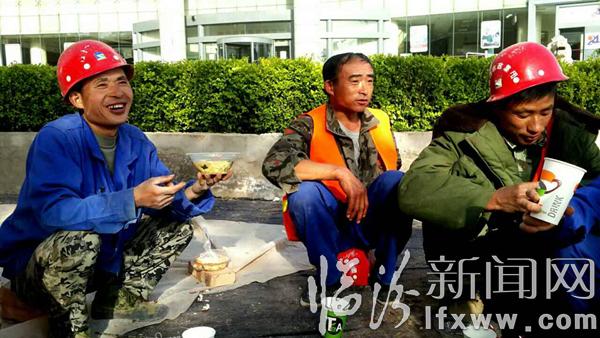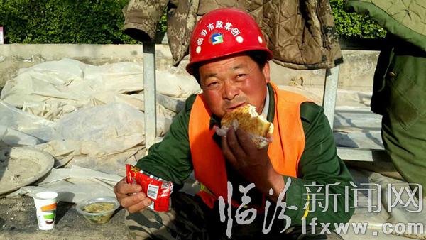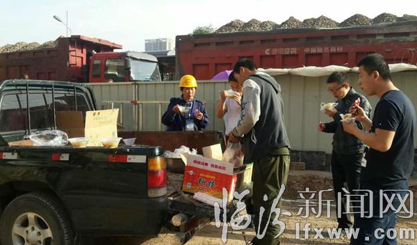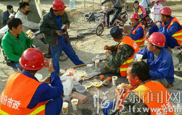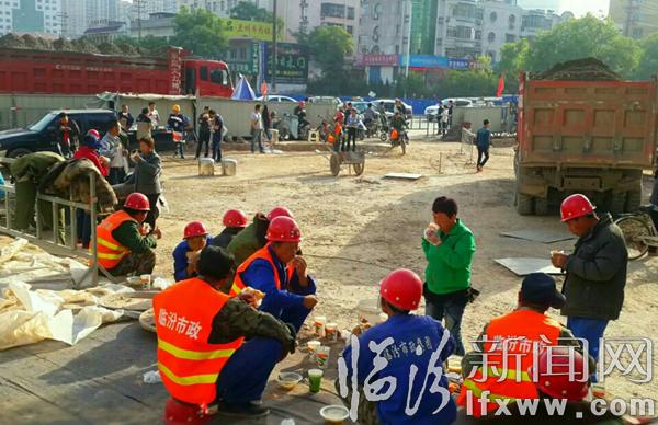 据市政保障人员说,每天早上6点,都会把热乎乎的早餐送到昼夜奋战的施工工地上,工人们吃完早餐便投入到紧张的施工工程中……(姚丙俊 摄)