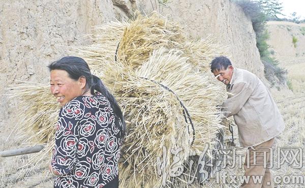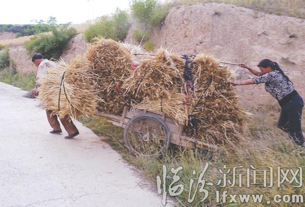经记者了解,原来他们是父子俩,老者已有88岁,老人挥舞着镰刀紧张忙碌。“父亲叫成三喜,我叫成国新。”老人的儿子介绍,这块地有点坡度,不适宜机械收割。最主要的是家里养了几头牛,手工收回的麦秸,还可以当牲畜的饲料。“父亲干活不逊于我这年轻人,两人一天能割4亩地。” 远方的乌云挡住了夕阳,翻过山梁,陶村堡的张姓夫妻俩将收割好的麦子,满满地装了一平车,丈夫前边拉,妻子后边推。“孩子远在深圳打工,几亩坡地的麦子,我俩用不了几天就能收完。”记者 王隰斌