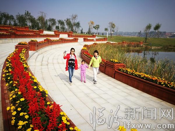 游人欢乐的行走在丹河龙门湿地公园