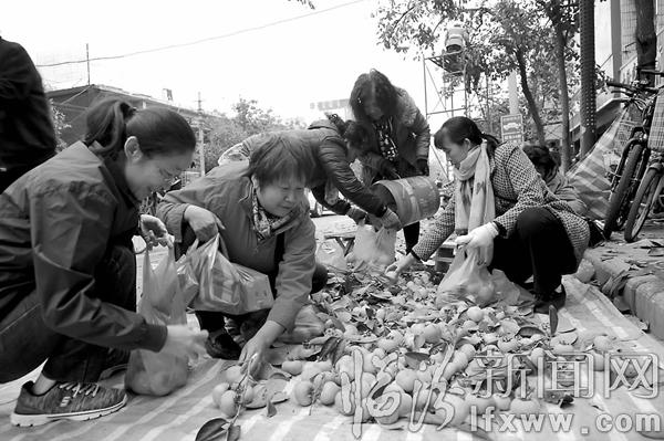 临汾新闻网讯 每到柿子成熟的季节,市绿化队都要集中采摘和现场销售柿子。近日,工人们在市区鼓楼东大街采摘、销售柿子。 记者 李自强 摄