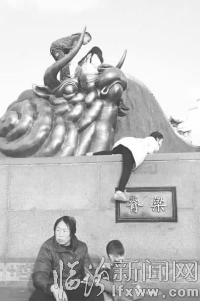 临汾新闻网讯 12月24日下午,记者在鼓楼广场看到,数名小孩攀爬上鼓楼广场的雕塑“脊梁”,在上面嬉戏玩耍,十分危险。本报提醒,为了自身安全和城市形象,家长应教育孩子,文明娱乐,安全游园。
