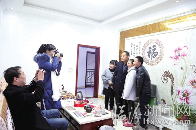记者用手中的相机给儿女双全的村民逯振拍个全家福。13岁的孩子逯进开心地说:以后再也不用租房子住了,住到新家真好,我要继续好好学习!”