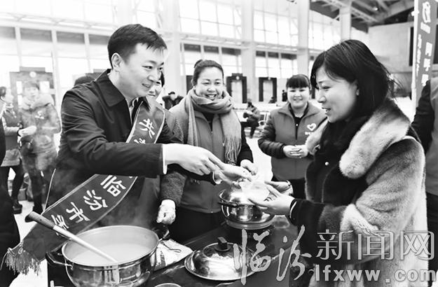 临汾新闻网讯 2月11日,在城西客运站,青年志愿者将热气腾腾的汤圆送到旅客手中。当日,团市委联合城西客运站举行“温暖春运路浓浓元宵情”主题活动,祝福广大旅客平安出行。