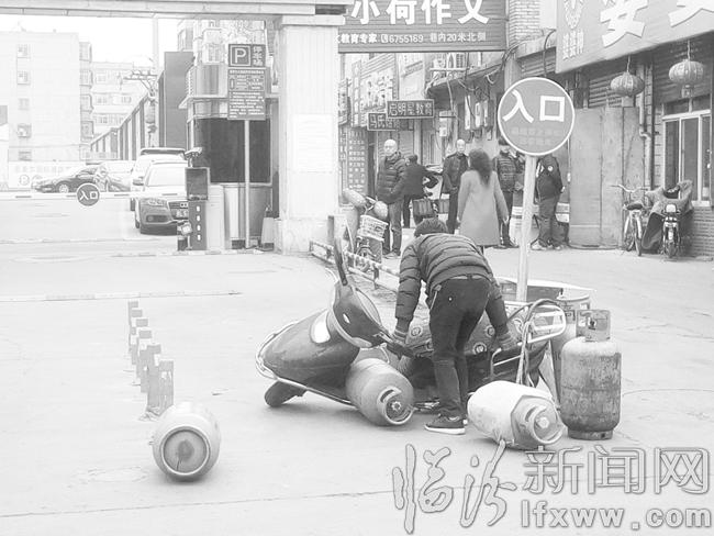 临汾新闻网讯 2月28日,在市区体育南街后贡院胡同口发生危险一幕,一青年男子骑电动车拉着5罐液化气在该路口摔倒,5罐液化气散落一地。该男子介绍,这是刚从旁边饭店拉出来的空罐,由于绳子没捆好导致液化气钢瓶散落。