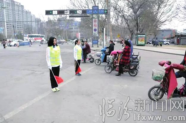 图为大学生志愿者在交通岗协助民警指挥交通、劝导行人走人行道、斑马线,严格遵守“红灯停、绿灯行”等文明交通行为。 记者白洁摄