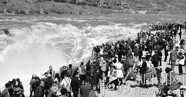 临汾新闻网讯 4月2日,众多游客在吉县黄河壶口瀑布游览观瀑。清明假期,黄河干流晋陕峡谷正值桃花汛期,壶口瀑布水量增大,景色壮美,吸引了众多游客。
