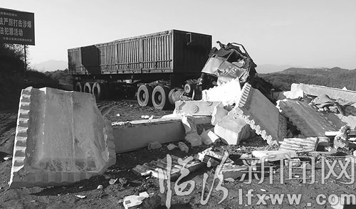 11月7日,记者接到线索来到现场时,一辆洪洞籍半挂大货车仍然停在事故现场,驾驶室严重变形,货车周边堆满了坍塌的界楼石材。当地村民说,出事那一天是11月2日,前一天刚下了雨,这一带雾特别大,能见度只有20米,驾驶员可能是因为这个缘故遭遇不测。