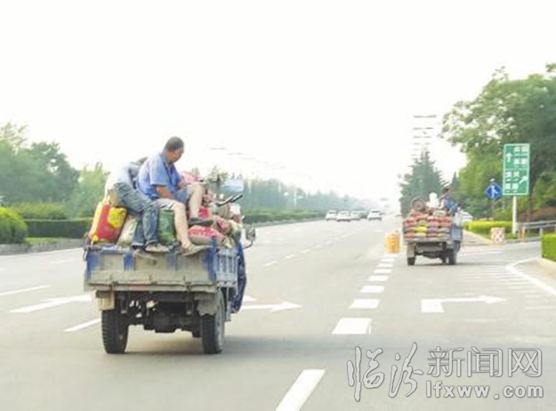 临汾新闻网讯 6月26日,在滨河路上,一辆满载货物的农用三轮车上坐着两个人,这两人的部分身体悬在车外,一旦车辆颠簸,极易坠车。