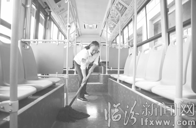 图为司乘人员清理车厢卫生。