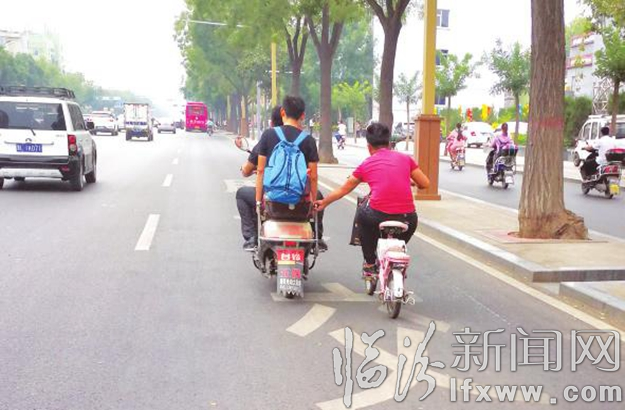 临汾新闻网讯 8月19日,记者在鼓楼南北街看到,公交车道成为了一些电动车、自行车的“快速”车道。在五一路口,两辆电动车驶入公交车道,一辆电动车似乎动力不足,骑行者抓住另一辆电动车的尾部快速行驶,十分危险。记者 苏亚兵 摄