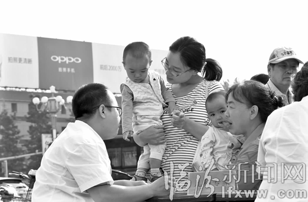 临汾新闻网讯 9月9日,我市在平阳广场举办了2017年“服务百姓健康行动”义诊活动。市卫计委组织市人民医院、市中心医院、市妇幼保健院、市第二人民医院、市第三人民医院等9家市直医院参加了活动。各医院派出医疗、药学、护理专家,开展了常见病、慢性病、肿瘤、儿童疾病、地方病等疾病的咨询、初步筛查、诊断和一般治疗,前来就诊和咨询的群众络绎不绝。图为市第三人民医院儿科专家陈永强为儿童义诊。