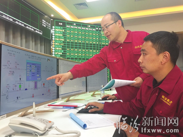 日前,临汾热力公司副总工程师陈正鹏、张岩正在热力调度指挥中心总控室查看市区各换热站水力平衡。
