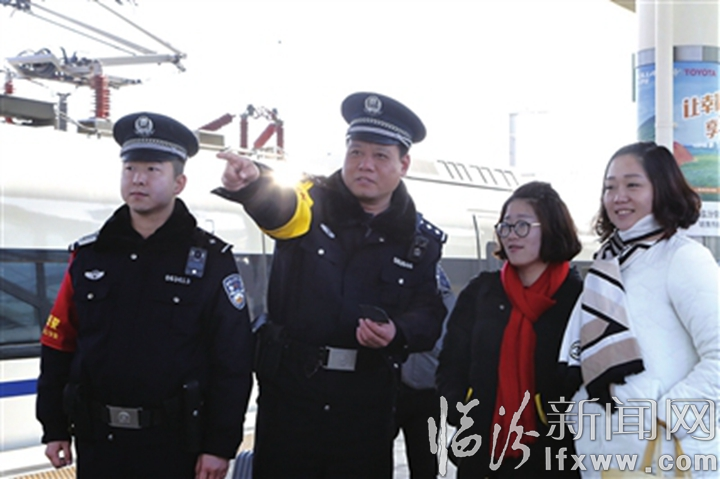 临汾新闻网讯 近日,临汾铁路公安处多措并举为旅客提供安全引导、主动问候、重点帮扶等温馨服务,保障旅客春运期间安全出行。图为民警正在解答旅客询问。(杨佩敏)