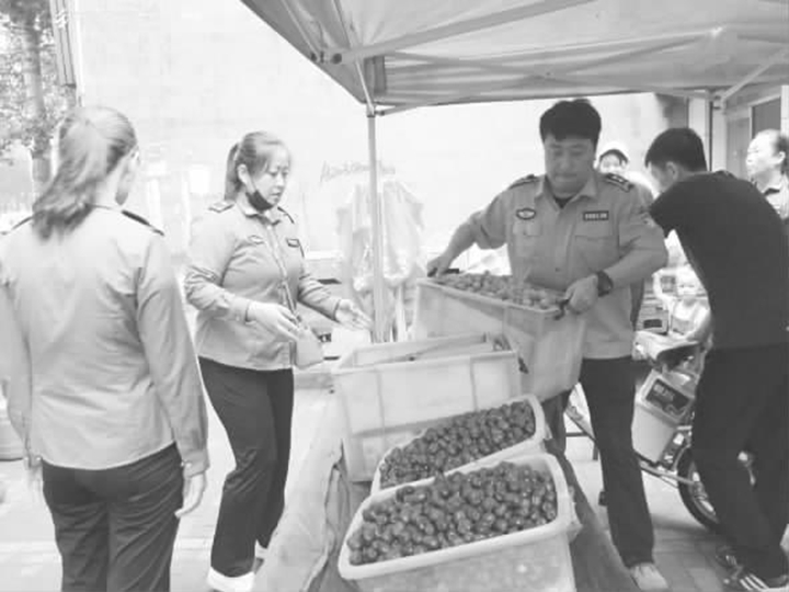 这些商铺位于解放路与二中路十字口的东南角,商户们一大早就将蔬菜、水果、鱼、肉等物品搬到店外销售。市容监察支队路东中队负责商户货物进店铺的工作,经过工作人员的劝说和解释,得到了全部商户的理解。在搬运货物中,30名工作人员也加入其中,很快就将店外货物全部搬入店铺。