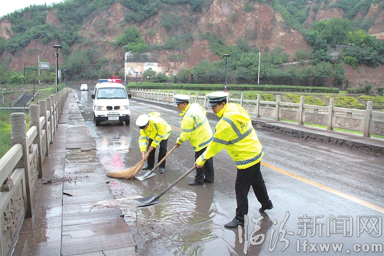 连日来,古县雨水天气造成路面严重积水,辖区涧河桥路面积水给过往行人造成极大的不便。大雨过后,古县公安局交警大队民警集体赶赴一线,及时排查路况,清理积水、泥石流,摆放警示牌,确保驾驶人安全通行。(孟繁霞 摄)