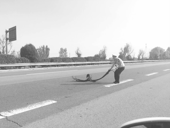 民警赶紧将轮胎皮,小心翼翼地拖移到应急车道边护栏板下,并联系养护部门尽快清理路面。