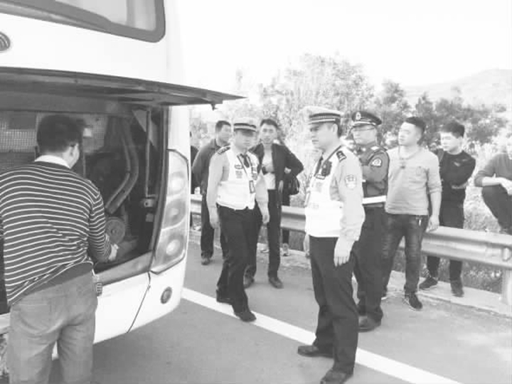 经询问得知,该大巴由临汾开至乡宁,车上有20位乘客,由于车辆在途中出现故障,不能移动。民警了解情况后,为保证旅客安全,遂将旅客转移至防护栏外等待。
