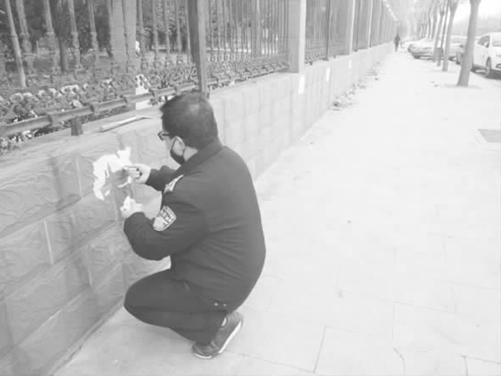 “前一天我们巡查时还没有,这都是晚上贴的。”据工作人员介绍,贴小广告者往往与市容监察人员“打游击”,趁他们下班悄悄贴。“这样的墙面不平,不能用铲子,只能用手一点点扒、一点点抠,不易清理,往往我们清理的速度赶不上他们贴的速度,让人防不胜防。还有往墙面、地面、下水道盖上刷涂料的,十分影响市容市貌,希望他们能提升公德意识,维护城市容貌。”