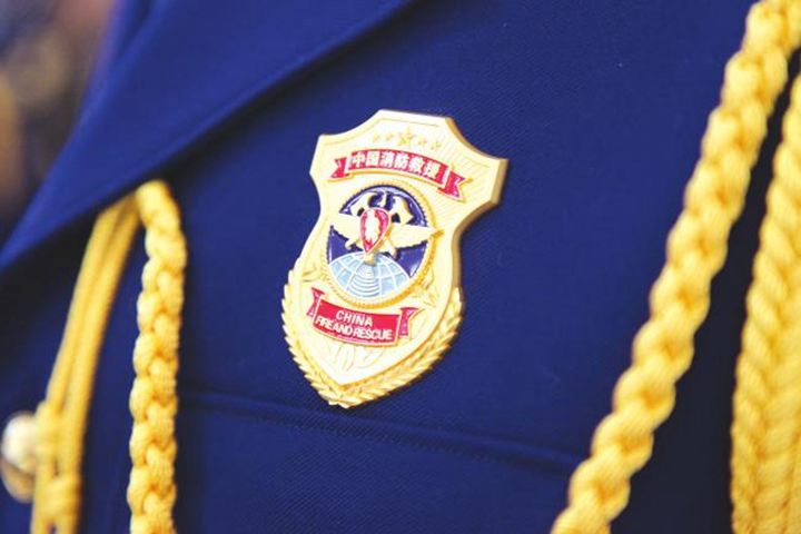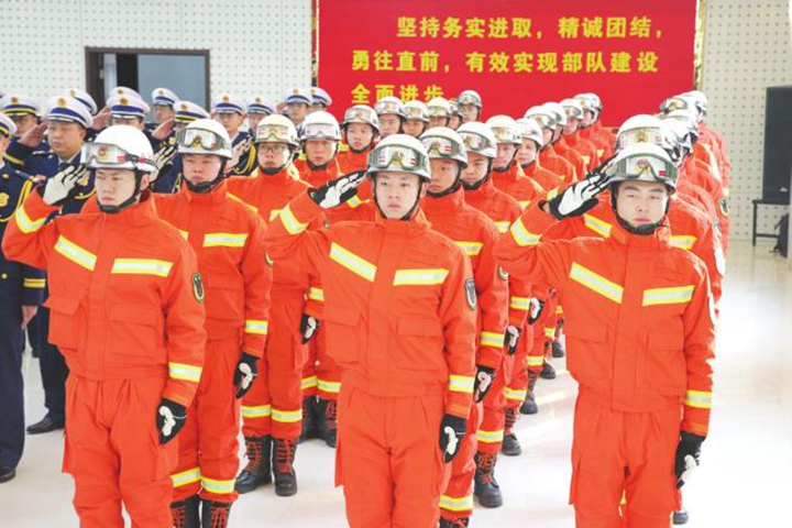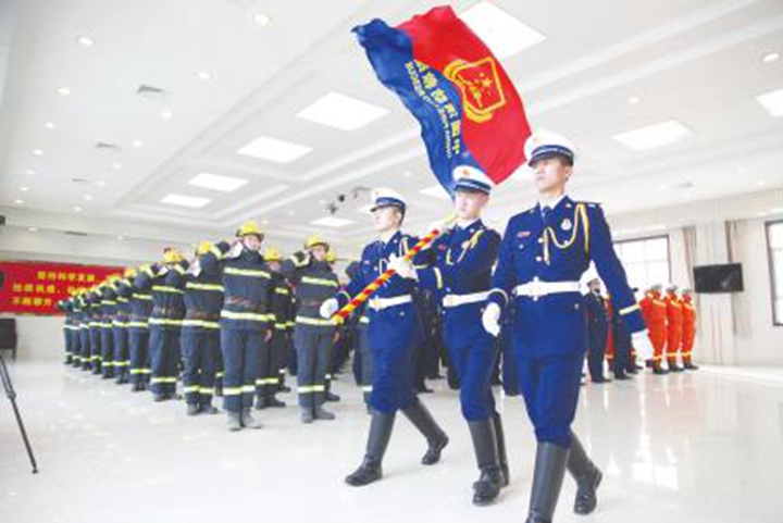 当天上午10时整,迎旗、授衔和换装仪式正式开始,全场高唱国歌,三名礼兵擎“中国消防救援队”队旗,迈着整齐的步伐行进至主席台,全体消防指战员向队旗庄严敬礼。