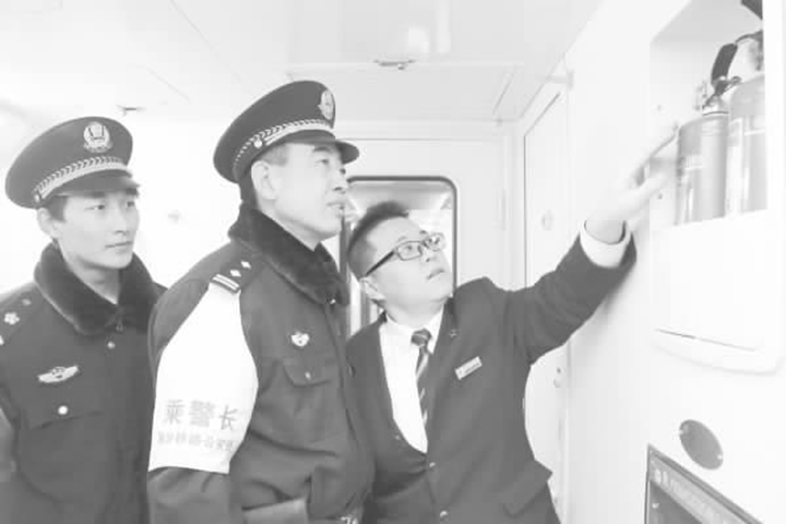 临汾新闻网讯 春运期间,临汾铁路公安处加强列车消防检查,全面排除各类火灾隐患,确保旅客乘车安全。图为6045次旅客列车乘警在对消防器材进行安全检查。