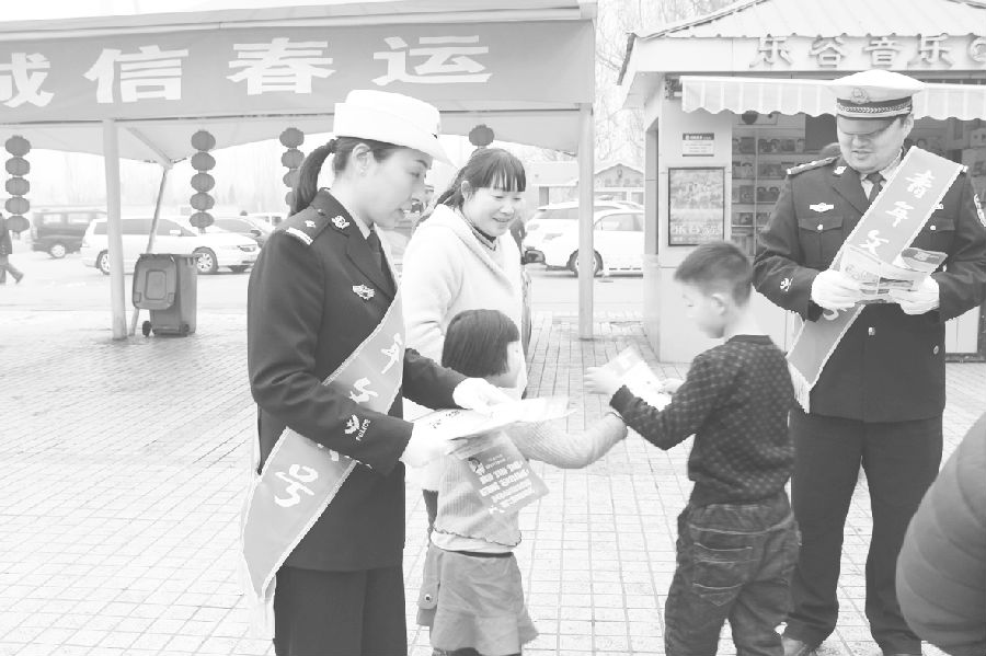 民警用实际行动践行着志愿服务精神,通过宣传交通安全知识、服务他人,共同引导人民群众共创文明和谐畅通的春运道路交通环境。