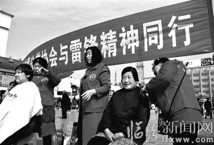 临汾新闻网讯 3月5日上午,我市学雷锋志愿服务集中活动誓师大会在市区平阳广场举行,来自全市文教、卫生、学校和市老龄志愿者公益协会敬老助老学雷锋服务队数百人参加了活动。图为志愿者在为市民免费理发。