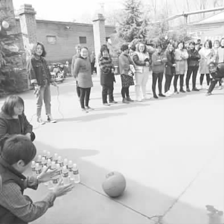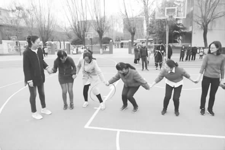 在“无敌风火轮”的比赛场地,只见女教师们手拉着手将呼啦圈传给下一个人,大家大声地讨论着各自的战术,操场上不时传来阵阵爽朗的笑声。