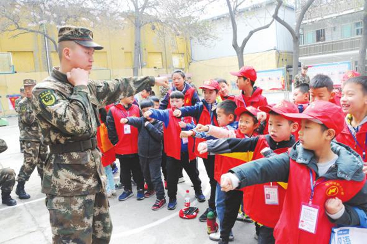 随后,小记者们被分成了几个小组,每一组都有一名武警战士为教练,手把手地教他们擒敌拳。虽然小记者们年龄小,身体条件有限,可学习劲头十足,在武警战士们的指导下每个动作做得像模像样。