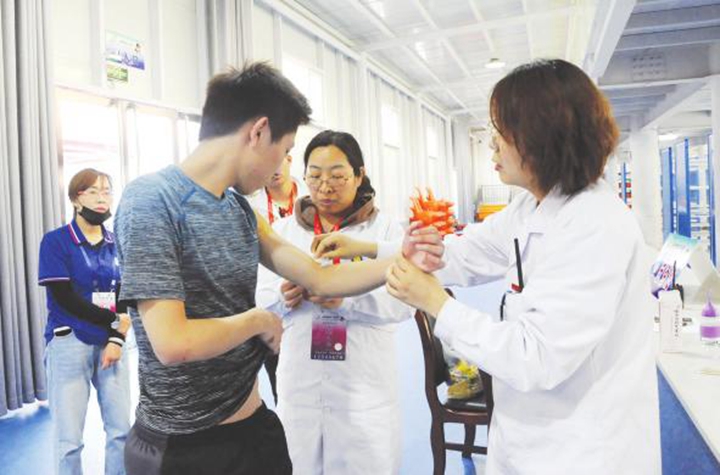 在医务处,来自临汾市第三人民医院的医护人员,正在对一名因测试擦伤的运动员进行处理。