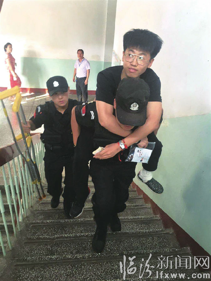 6月7日早上,董晓阳乘坐学校统一安排的大巴车来到临汾市第一实验中学门口,他拄着拐杖缓缓地走着,正在执勤的民警亢立清、姬鹏飞看到后,立刻过来询问。了解情况后,两位民警决定背他进考场。