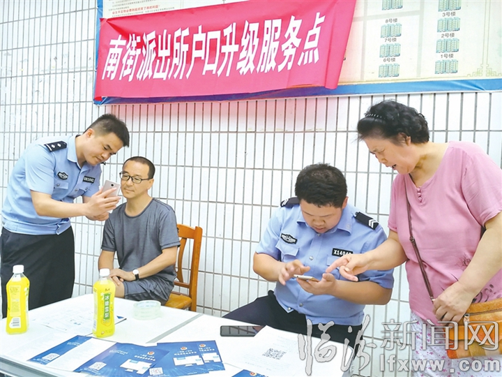 自公安部门的“一网通一次办”平台运行以来,为群众办事提供了诸多方便,随之户口本的升级工作也全面展开。市公安局直属分局南街派出所的民警们为了方便、加快注册进程,不仅在辖区内设置了服务点,而且利用下班时间入小区服务,手把手地教群众进行注册。图为该所民警在体育南街现场指导群众的情景。