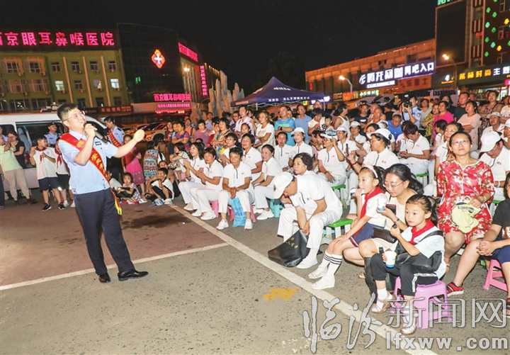 临汾新闻网讯 7月24日晚,由临汾铁路公安处、尧都区车站街办事处主办的“平安站车路、金盾护你行”警民联谊会在临汾火车站站前广场举行。通过警民联谊,加强了广大群众共建平安铁路、共享安全出行的责任意识。图为演出现场。