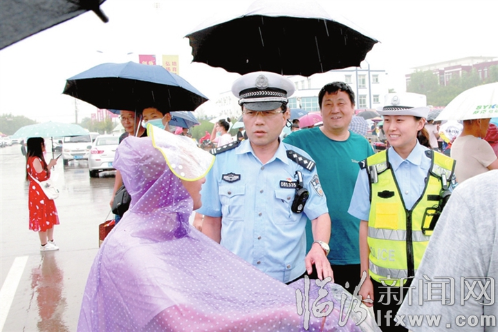 考生家长为交警撑伞遮雨