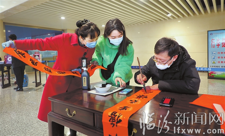 临汾新闻网讯 二月四日,临汾民航机场航站楼内充满了芬芳的墨香与浓浓的年味儿。图为机场工作人员正在为旅客书写春联。