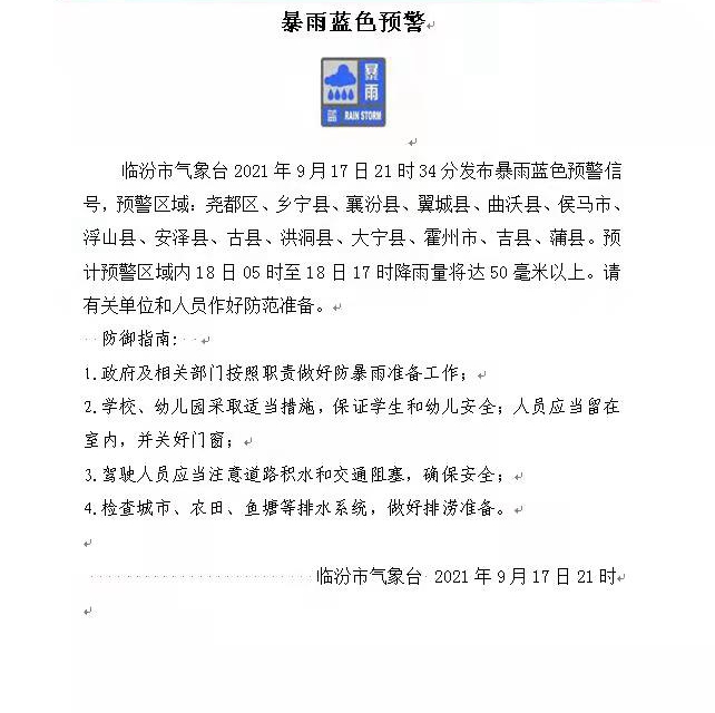 临汾市气象台2021年9月17日21时34分发布暴雨蓝色预警信号,预警区域:尧都区、乡宁县、襄汾县、翼城县、曲沃县、侯马市、浮山县、安泽县、古县、洪洞县、大宁县、霍州市、吉县、蒲县。预计预警区域内18日05时至18日17时降雨量将达50毫米以上。请有关单位和人员作好防范准备。