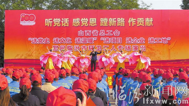 临汾新闻网讯 10月26日是山西省第25个“环卫工人节”,省总工会“送党史、送文化、送温暖”“进项目、进企业、进工地”慰问演出团来到市环境卫生服务中心,为一线环卫工人送来一场歌舞、小品、京剧、讲述、音舞诗画等形式多样的视听盛宴和慰问金,带来了职工“娘家人”浓浓的关心和关怀。图为500余名环卫工人一起观看演出。