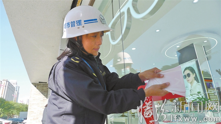 沿着向阳西路,只见她眼观八方,看到乱停乱放的非机动车,立即上前摆放归位;看到商户橱窗上张贴的广告彩页,她一边宣讲城市管理法律法规,一边督促商家即刻清理……从向阳西路滨河路口到郭家庄路口,她和队员们脚步不停,一遍又一遍地巡查。记者跟了她们一上午,她们手中的活儿始终没有停下。