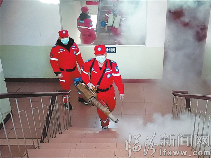 临汾新闻网讯 义务消杀显担当,志愿服务暖人心。连日来,中华志愿者协会应急救援志愿者委员会临汾服务队的志愿者们带着几十斤重的弥雾机、酒精等消杀用品,对市区部分单位、商场、学校及多个小区进行全覆盖、无死角、地毯式消杀,为保障群众生命安全和身体健康贡献志愿力量。图为志愿者们对尧都区屯里镇派出所进行全面消杀。