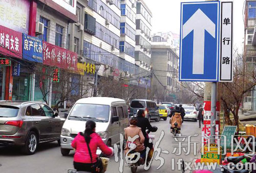 商会巷是一条由南向北的单行线道路,记者在巷口发现多辆汽车逆行,使并不宽敞的道路拥挤不堪,非机动车辆及行人纷纷避让。