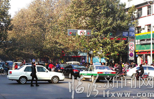 中午11时30分,在解放路财神楼十字路口,此时正值解放路小学、放学,等待接孩子放学的家长较多,可是从这个十字路口通过的车辆在黄灯亮起时仍有车辆抢行,而另一方向的车辆已经行驶到道路中央,顿时十字路口出现拥堵。