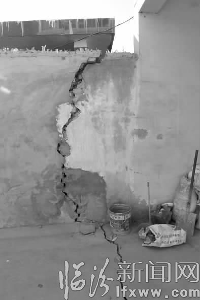 塌陷的路面致使张先生家的外墙裂开了一道缝。记者 苏亚兵 杨全 摄
