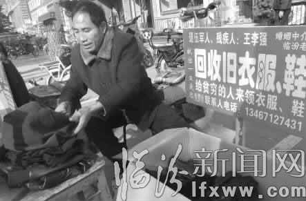 “这个问题困扰了我好几天,自己想办法的同时,也找人一起商量,最后终于想出了免费回收,免费送人的办法。”王李强告诉记者,这样做不但解决了许多市民家中存放的旧衣服,而且还能给贫困的人带来温暖。决定后,王李强就做了一个牌子,放在擦鞋摊的旁边。