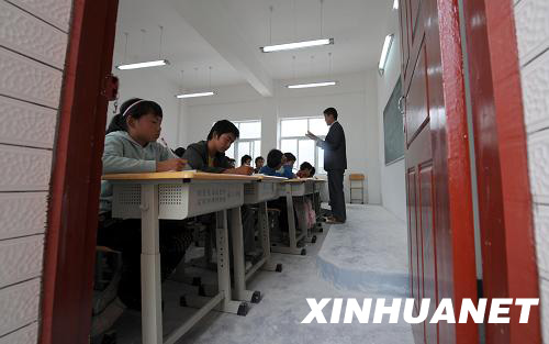 5月12日,文县城关镇贾昌深圳小学四年级学生在新教室内上课。新华社记者 韩传号 摄 当日,甘肃文县城关镇贾昌深圳小学400多名师生告别板房教室,搬入新校舍上课。贾昌深圳小学是甘肃地震重灾区文县建成的第一所灾后重建学校。