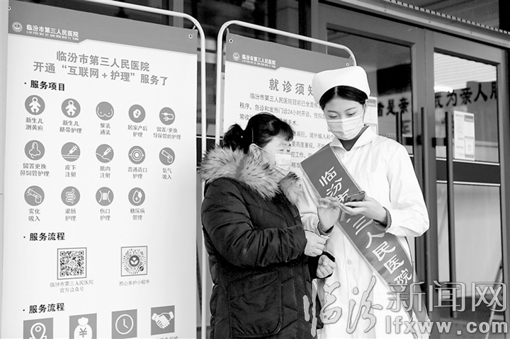 临汾新闻网讯 12月10日,市第三人民医院的护士在帮助一位患者家属用手机下载“互联网+护理服务”小程序。