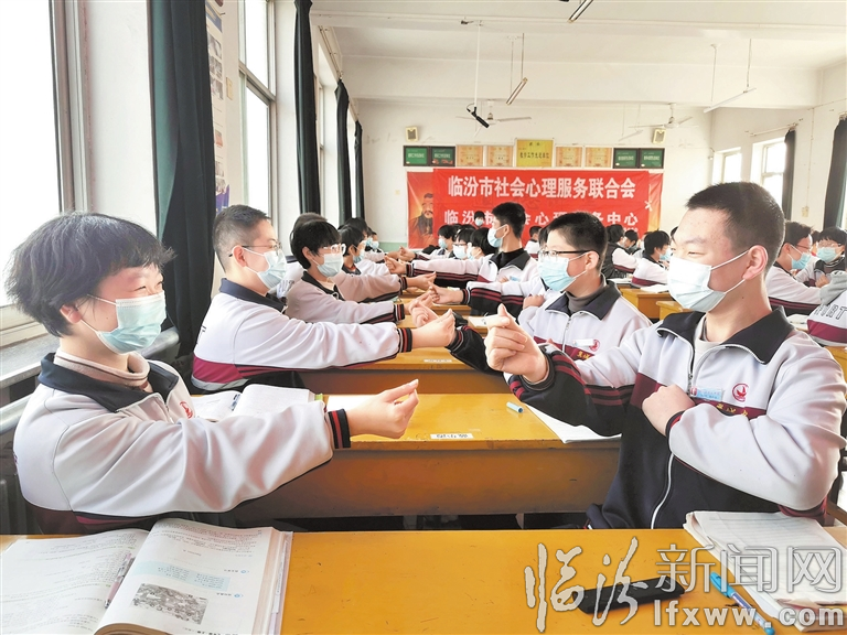 临汾新闻网讯 近日,由市卫健委、市教育局主办,市社会心理服务中心承办的2021年心理健康科普大讲堂巡讲进校园活动走进翼城县五中。巡讲中,临汾二中专职心理老师张娜妮详细讲解了处于青春期学生的常见问题,以全新的视角,让同学们认识自己、爱上自己。 图为张娜妮让同学们以比心的方式表达友谊,促进其身心健康。