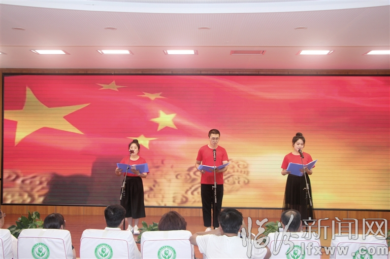 6月29日,临汾市医师协会、临汾市第五人民医院共同举办了以“庆七一、倡清廉、树新风 喜迎二十大”为主题的文艺汇演。图为诗朗诵《红色的中国》表演现场。本报记者 摄